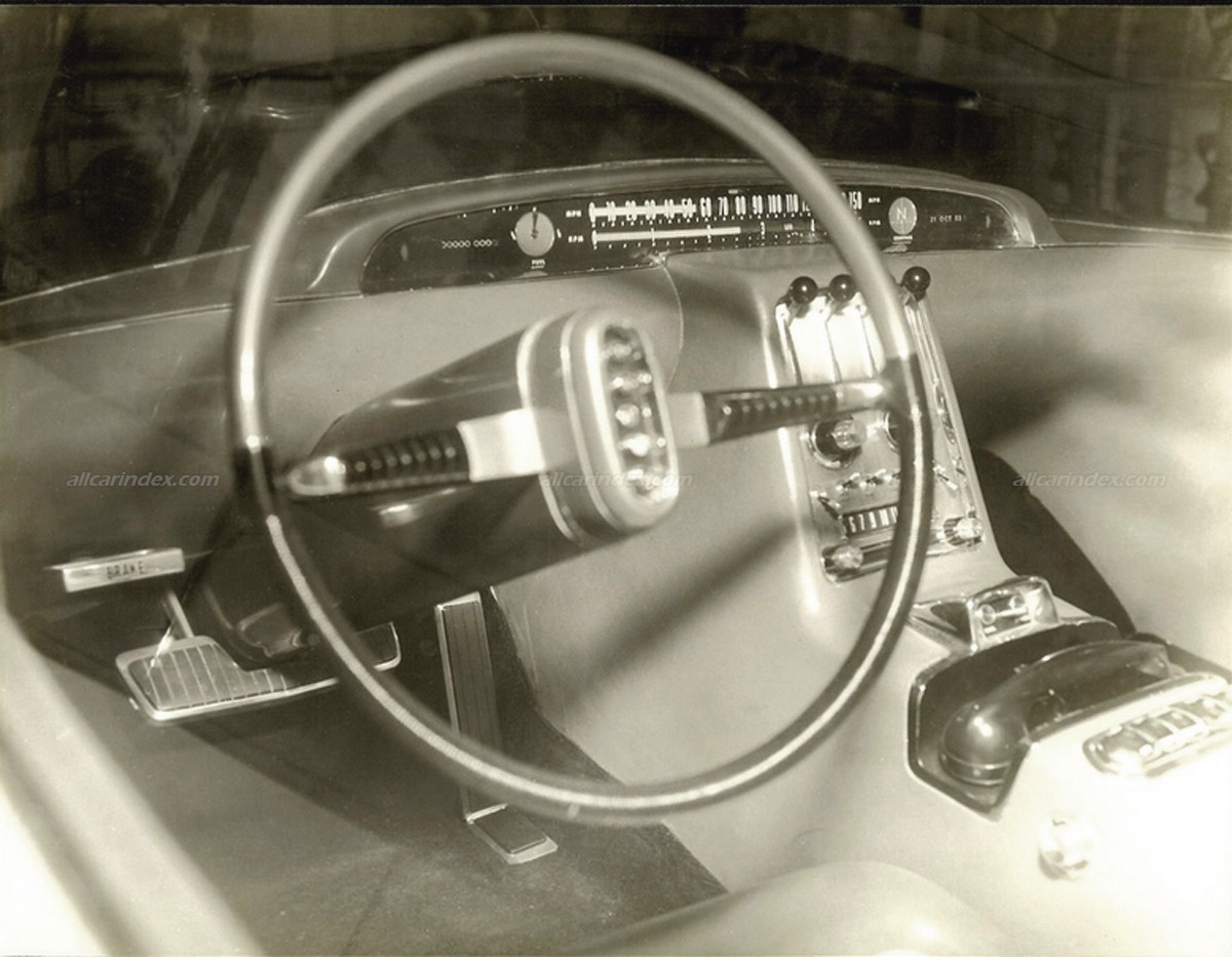 Safety and engine warning lights were strategically placed in the windshield header bar in front of the driver for quick and easy visibility. The main instrument panel featured a speedometer indicator showing speeds up to 150 mph, a stylized tachometer, a compass, a "magic eye" fuel gauge, and an electrically-operated calenometer, demonstrating Ford Motor Company's forward-thinking approach to automotive design.