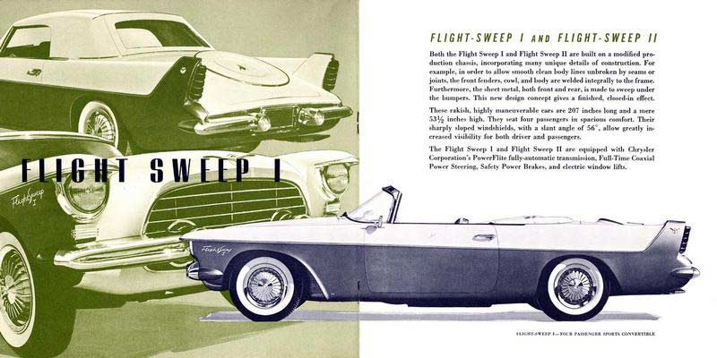 In addition to the Flight Sweep I and II, Chrysler also introduced the Falcon, a low-slung two-passenger roadster that embodied American sports car styling. Built on a 105-inch wheelbase modified production chassis, the Falcon featured wide-horizon windshield with rearward sloping posts, full wheel openings, and upswept rear fenders with recessed taillights.