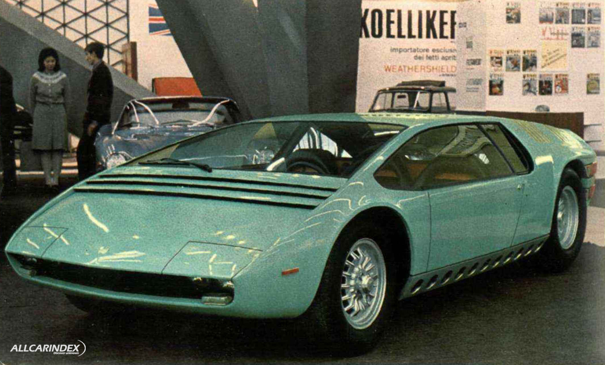 The use of this solution is managed by the driver through three horizontal air-wings which can be positioned from the interior. Such a system introduces a personal touch without interrupting the windscreen-bonnet line. This is also an advantage when maintenance work must be done to the brake pumps, to the radiator, the batteries and the heating system. The air-wings provide adequate interior ventilation and the correct functioning of the heating system, but they are closed at high speed. The side view gives the impression of a marked aerodynamic-shape, recalling in fact the shape of a bullet. The windows, instead of ending at the cut of the front door, continue almost to the limit of the wheel arches. The smooth surface of the side is interrupted at the height of the rocker where a brushed aluminium grille is the only decoration, openly following the treatment carried out by Giugiaro on Bertone's Iso Grifo coupe, with a touch that allows its visual encumbrance to be lightened. The headlights are partially concealed by the bonnet that begins flush with the mudguard and continues, more recessed, as far as the windscreen base. The roof drops slightly towards the rear window almost horizontally, and this becomes even more obvious if one considers that the roll-bar is only 137mm higher than the sharp edge of the tail frame. The rear end is distinctive for the 4 groups of 5 louvres each which also contribute to reduce its impressiveness. The tail is truncated, cut very high, and it gives the car stability and a powerful appearance. In order to benefit visibility at the rear, an almost horizontal opening was added to the rear window of the roof panel in the upper part of the tail. This contrivance also allowed the engine comparment to be well ventilated. To give movement to the rear end, two exhaust pipes shoot out of the tail frame, one of them is false and allowed the side lights to be housed. The need to show up the sporting vocation of the car even advised against the use of bumpers. The two external side members, which run flush to the doors, and the tanks moved to the engine compartment, have allowed a flat central platform to be used leaving space for interior roominess. These structural contrivances, together with extra width (1855 mm) permitted three sporty looking seats to be housed. The driving position is central and the steering-wheel is strangely situated in an almost provocative way: it has a chalice-shaped structure which is deformable on impact. From above, by looking through the rear window, one can appreciate the powerful yet extraordinarily balanced architecture of the 8 cylinder engine. The Chevrolet V8 engine is mounted in a longitudinal rear position, immediately behind the seats. This lay-out is markedly different from that of the Bizzarrini series sports car with a front engine. The 4-speed injection mechanical engine, mounted as an experiment, delivers 400 bhp and it can push the prototype to a speed of 330 km per hour.