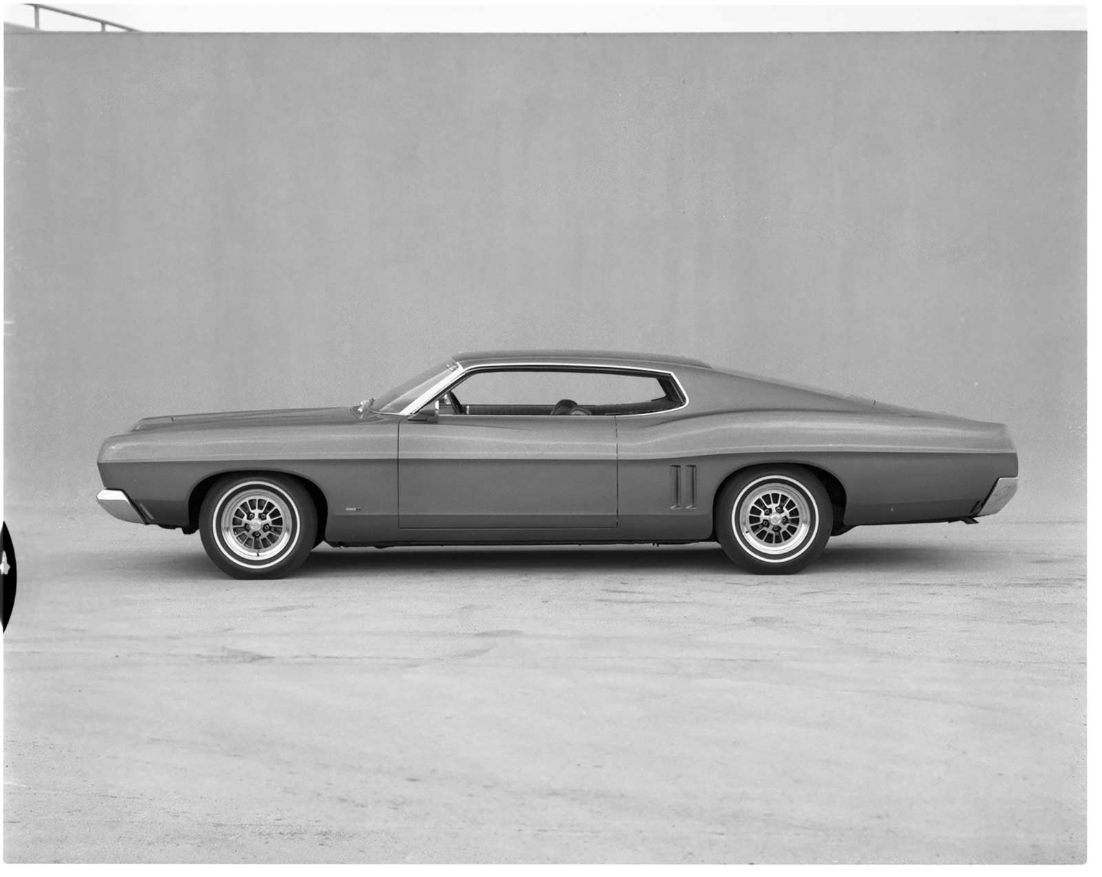 The 1968 Ford Fiera was built on the XL platform and featured a series of styling modifications that gave it a distinct, performance-focused appearance. Among these changes was a lowered roofline, which altered the angles of both the front and rear windshields, resulting in a notably sleek profile. The grille, mostly stock in appearance, was recessed more deeply than standard and flanked by rectangular auxiliary driving lights placed on either side of the original grille divider.