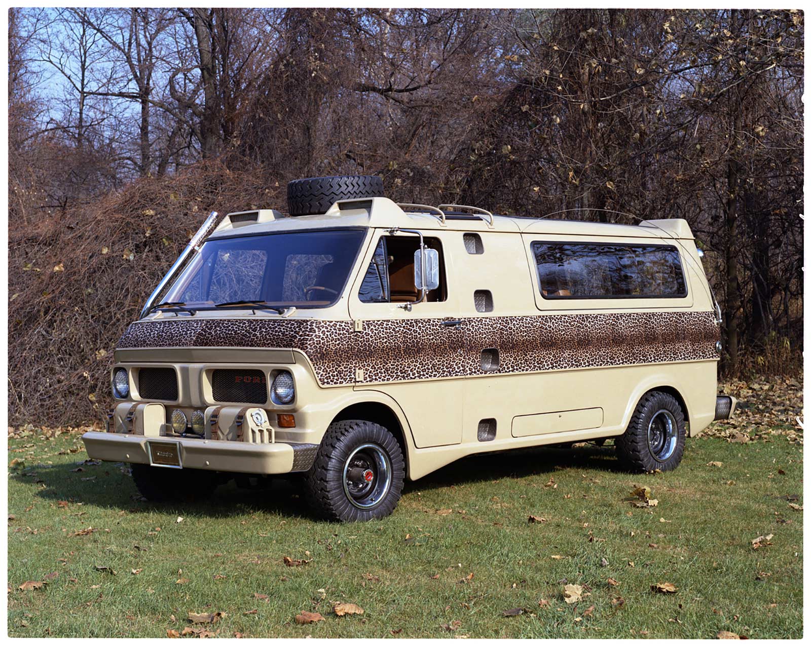 Let’s get this out of the way: the Econoline Kilimanjaro isn’t exactly subtle. This is a van with leopard skin print. Ford wrapped a solid 15-inch-wide band of it around the vehicle’s beige exterior, because, well, it’s the ‘70s, and subtlety was for people without spotlights mounted on their roofs. And that’s not a figure of speech: the Kilimanjaro literally has spotlights in containers above the windshield, a setup that’ll let you sweep the bush for game—or perhaps just the nearest zebra crossing.