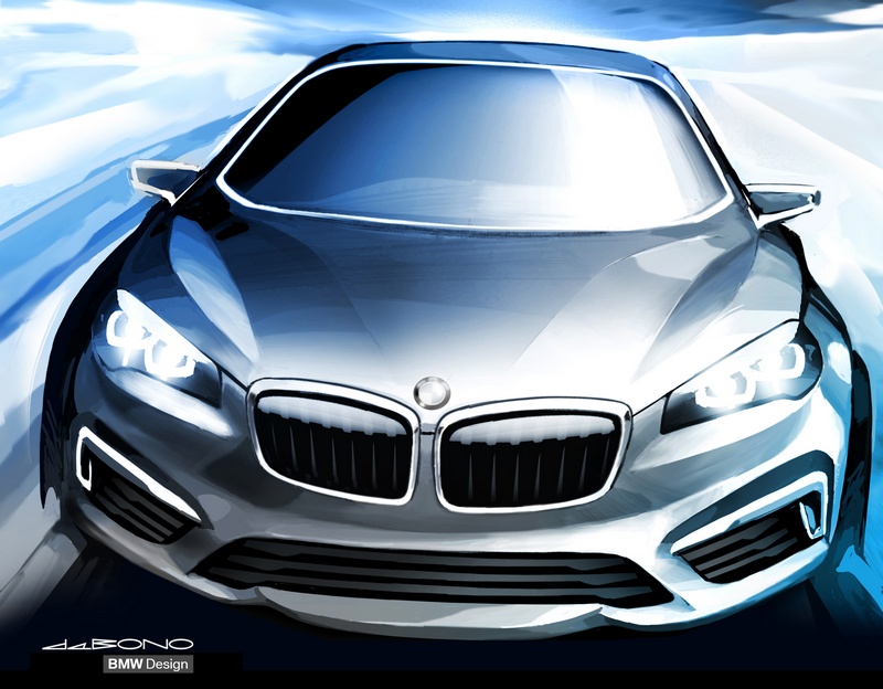 the bmw concept active tourer unmistakably retains the characteristically expressive bmw front view. the dominating element here is the distinctive, slightly front-tilted bmw radiator grille. the striking twin headlines with led positioning lights (eyebrows) stretching far back into the side panels and the multi-faceted front apron combine to reinforce the sporty presence of the bmw concept active tourer. furthermore, the two large outer air inlets below the headlights emphasise the impression of width created by the front view.