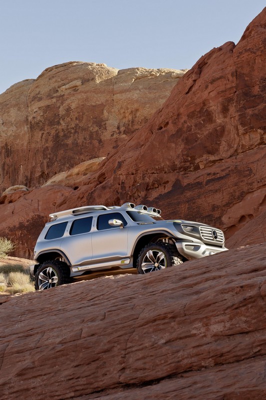 the mounted roof distinctive to the g-class and the tripartite glass area also cite the fundamental genes of the classic off-roader from mercedes-benz, but represent a clear step forward. this is also evident in the large wheels, whose 20-inch rims give the ener-g-force a powerful, towering stance. the ener-g-force also plays on the utility factor in an entirely new way. for instance, the distinctive feature in the rear is a slightly off-centre pull-out compartment whose cover takes up the characteristic look of the spare wheel carrier of the classic g-class. this pull-out tool box can hold a wide variety of equipment items that consequently are quickly in reach without having to open the whole liftgate.