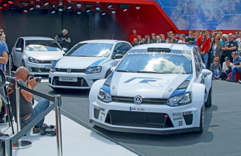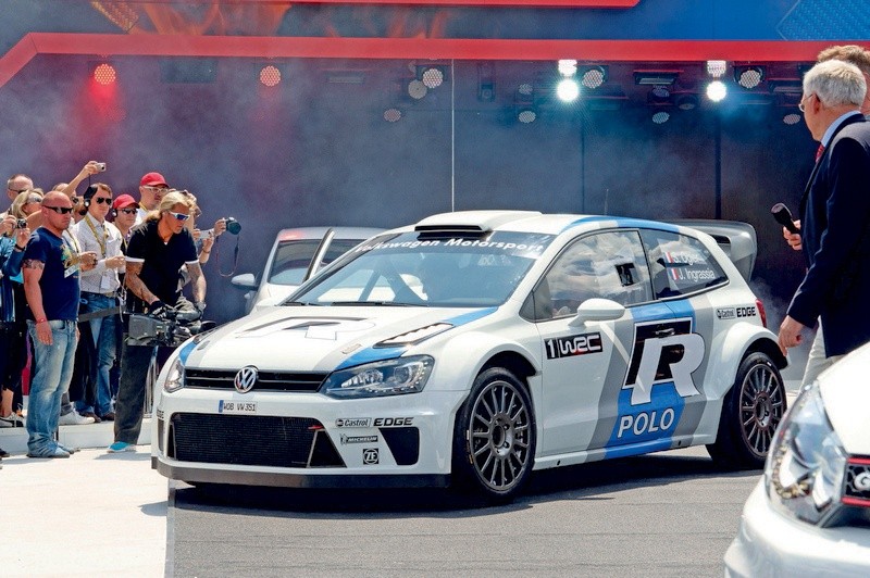 polo r wrc: with the newly developed polo r wrc, volkswagen motorsport is presenting a road-going prototype for the fia world rally championship. the “hottest polo ever” – as it was called by volkswagen head of development dr. ulrich hackenberg even at its first official airing – will be starting its tour around the globe from 2013 at numerous wrc races. at the heart of this racing version beats a 1.6 l tsi engine with approx. 220 kw / 300 ps power output, which ensures impressive acceleration from naught to 100 km/h in 4.1 seconds.