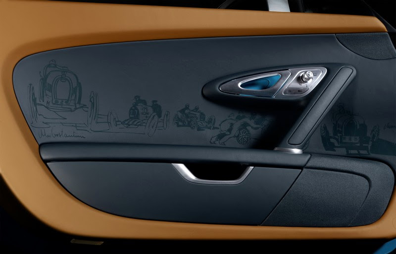 a special highlight of the interior is the racing scenes and vintage car motifs on the doors, which have been laser-engraved into the leather trim with the utmost precision and attention to detail. these images illustrate the most glorious moments of meo costantini’s racing career and the exciting world of motor racing in the 1920s. the interior trim of the door pockets and door handle recesses in “bugatti light blue sport” adds a dash of color.