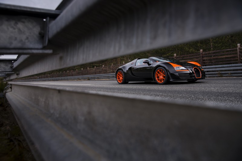 the bugatti veyron 16.4 grand sport vitesse has been on the market since the spring of 2012. its power comes from an 8 litre w16 engine, which pours 1,200 ps and a torque of 1,500 nm at 3,000 to 5,000 rpm to the road. its high performance handling can be attributed to a racing chassis which together with extremely fast-acting shock absorbers and reinforced anti-roll bars guarantees exact control of both the four-wheeldrive system and the entire vehicle. other factors that enable such performance at the upper limits include a standard carbon monocoque with high torsional rigidity and an outer shell made entirely of carbon fibre. keeping wind noise and air turbulence to a minimum in the vehicle’s interior is a particular concern with open-top vehicles. in the vitesse, a specially developed roof spoiler along with an intricately designed windbreak guarantees calm open-top driving; indeed these were preconditions for reaching the record-breaking speed of 408.84 km/h.