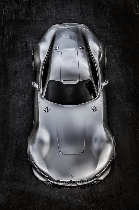 the sports car proportions that are a typical mercedes feature have been reinterpreted: the long bonnet has a flowing transition into a compact greenhouse offset to the rear, which takes the form of an aerodynamically efficient water drop to descend slightly at the rear, where it rests on the rear end with broad shoulder contours. the dynamic aura is accentuated by an extended, dramatic side contour and a pronounced bulge to the wheel arches, which blend into the low-slung, muscular bodyshell. the angled headlamps, with their colour scheme and determined look, convey a sense of sportiness and readiness to leap forward. this impression is reinforced by the bonnet with its expressive forms and motorsport details, such as the release catches on the bonnet and the fuel cap, for example. the red-glowing contour lines on the lower part of the vehicle create an effect similar to that of exterior ambient lighting and stand out from the silver-painted bodywork. this makes the mercedes-benz amg vision gran turismo look even more aggressive.