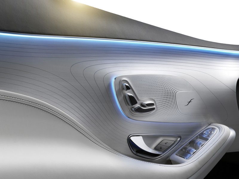 the door panels of the concept s-class coupé are made from aluminium. using computer algorithms delicate topographic lines were milled into the metal and mimic the contours of the door-mounted control elements. this creates an interesting light pattern with tiny sparkling highlights. for this creation the designers drew their inspiration from rock formations in utah, usa. the progressive perforations of the loudspeakers were also generated using algorithms and display some intelligent aesthetics of mathematics.
