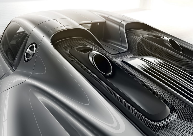 the main drive source is the 4.6-litre, eight-cylinder engine with an output of up to 608 hp. based on the power unit of the successful rs spyder endurance race car, the engine delivers revs of up to 9,150 rpm and a power output per litre of approximately 132 hp/litre – 26 hp/litre more than that of the carrera gt, making this the highest specific power of any naturally aspirated porsche engine. and it is not just the performance of the 918 spyder engine that stirs up an emotive response: the sound of this vehicle is just as impressive, and can primarily be attributed to the ‘top pipes’ – exhaust tailpipes that terminate directly above the engine in the upper part of the rear engine cover. no other series production vehicle features this solution.