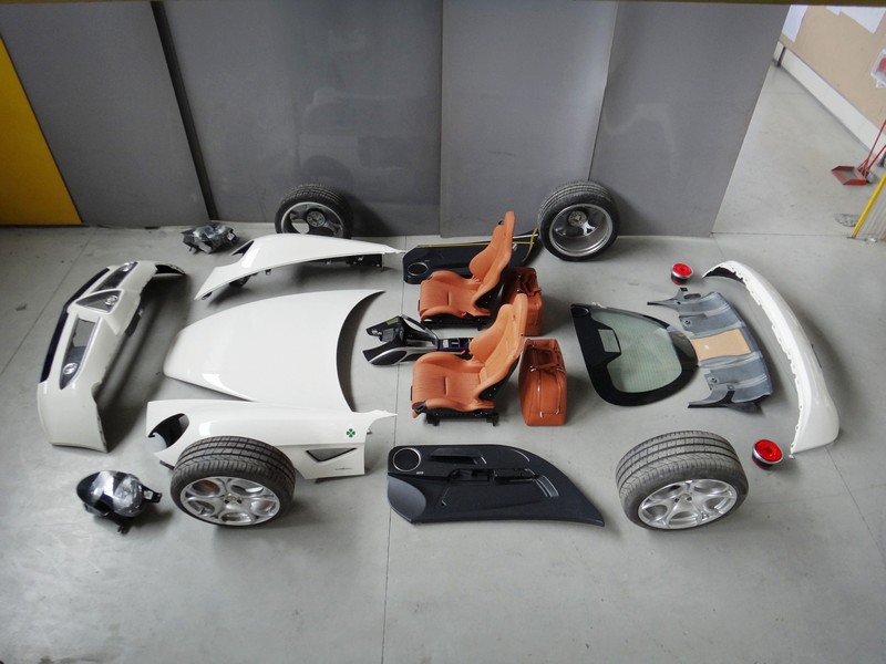 The Alfa Romeo 8C’s steel space-frame and other structural elements were retained to guarantee torsion stiffness, high performance and the quality standard. The frame members and the central carbon cell remained unchanged. Elements of the underpinning and the body, such as the engine bay and firewall, the windscreen and cowl, the a-pillar and the locks and hinges have been retained too, just as the dashboard and instruments, the pedals and the steering wheel.