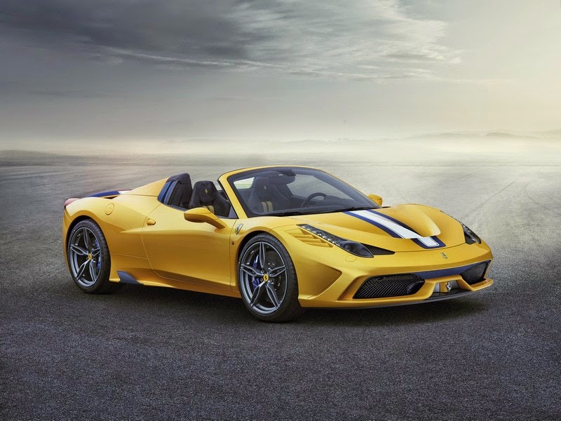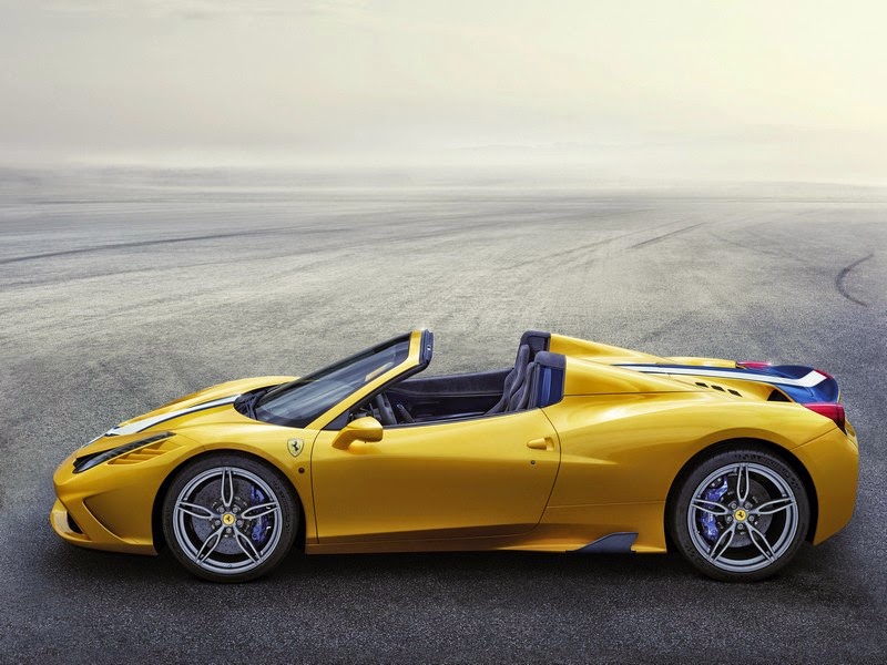 the 458 speciale a is being premiered in a unique triple-layer yellow livery with a blu nart and bianco avus central stripe as well as five-spoke forged wheels in grigio corsa. the cockpit has a distinctive racing-inspired look: lightweight yet exclusive materials have been adopted throughout and, of course, crafted with ferrari’s signature artisanal sophistication. this is particularly true of the finish of the dash, the moulded door panels and central tunnel in an exclusive blue carbon-fibre (also used for the treadplates) as well as the newly-designed seats in alcantara© with contrasting stitching and 3d technical fabric.