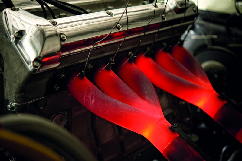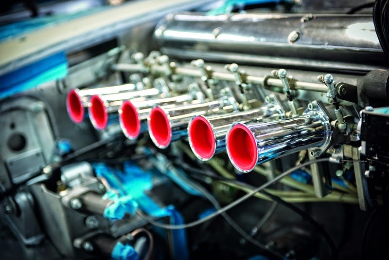 the compression ratio is 10:1 and today's car is supplied with three 45dco3 weber carburettors. these were homologated by jaguar for the lightweight e-type in addition to a lucas mechanical fuel injection system – which is being offered to customers as a cost-option (and which is fitted to car zero). the exhaust manifold is a steel fabrication and leads the exhaust gasses into twin pipes which take them through a centre silencer box to the rear of the car, where the exhaust system ends in twin polished tail pipes.