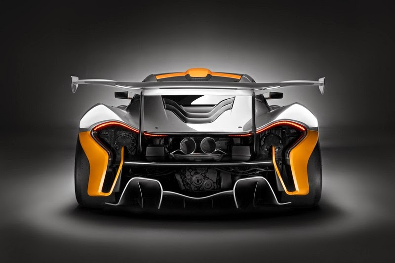 below the rear wing sits the exposed, centrally mounted exhaust, which is an all new design, developed exclusively for the mclaren p1™ gtr. made from inconel and titanium alloy, the system maximises the aural characteristic of the higher output 3.8-litre twin turbo v8 engine to maintain, and further emphasise, the mclaren sound. the design of the exhaust has also changed, with a straight cut twin pipe setup now used in place of the single exit exhaust.