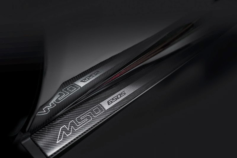 the striking mso 650s coupe concept has a stealth-like, menacing appearence, with subtle upgrades made to the exterior bodywork and within the driver-focused cabin. the mso 650s coupe concept is finished in ‘agrigan black’, which is a metallic black paint specially developed in-house with a deep ruby red metallic flake. this paint effect gives the exterior bodywork a dramatic colour change in direct sunlight, contrasting with the extensive use of satin-finished carbon fibre highlights. the lightweight carbon fibre accents, including the prominent front splitter and air intakes, are complemented by bespoke mso carbon fibre side blades and the unique mso ear diffuser.