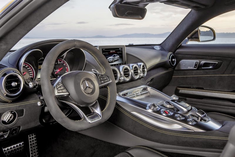 the central "aviation design" theme, which is the hallmark of mercedes-benz sports cars, has been restyled. the extreme emphasis on the width of the dashboard, which creates an impression of a powerful wing, dominates the cockpit of the gt. four central spotlight-style vents and the individual vents at the right and left ends of the dashboard reinforce this impression. in conjunction with the high beltlines, the concave-shaped door panelling and the dynamic centre console, the gt comes across as a genuine driving machine and consummately integrates the driver into the cockpit thanks to the low seat position.