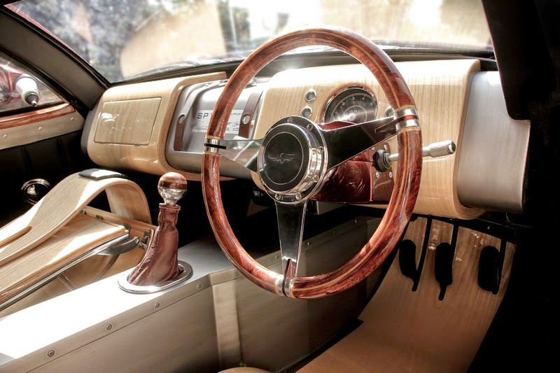 at the heart of the rigid steel chassis is a naturally aspirated 3.7 litre ford v6 engine, as used in the morgan v6 roadster. a new suspension setup, a bespoke engine management system and custom sports exhaust enhance the driving dynamics of the sp1. the wooden frame of the coach-built body is constructed using ash wood, combined with african bubinga red hardwood chosen by the client to represent his business life spent on that continent.
