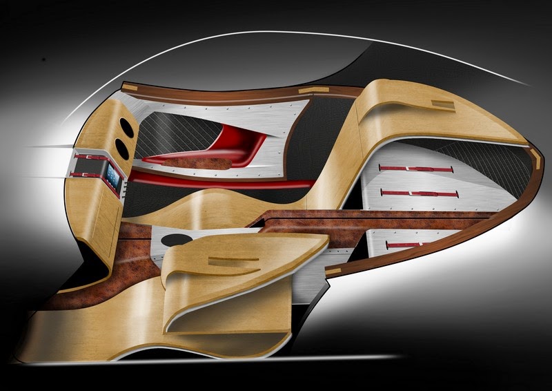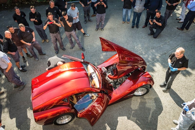 the aluminium body has been hand formed over a wooden ‘egg box’ construction, using an english wheel. to ensure structural and aerodynamic excellence, cutting-edge digital design and simulation tools were used to prove surface styling prior to lengthy fabrication.