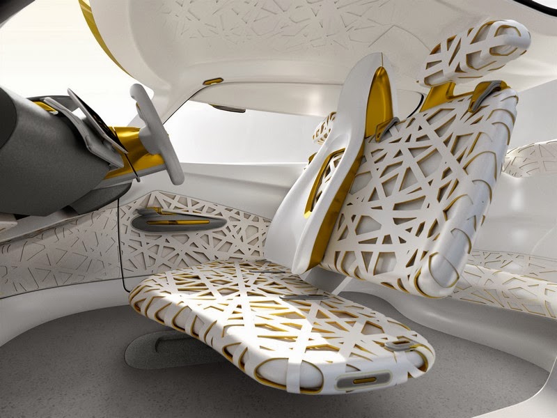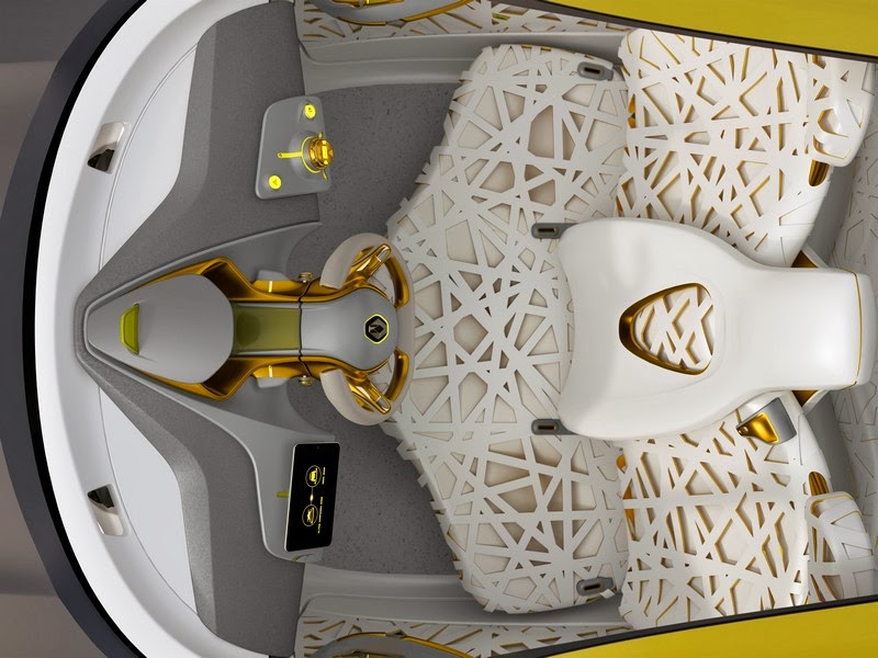 the interior of the kwid concept is designed to serve as a snug cocoon and is inspired by a bird’s nest. the vehicle’s seats, suspended over a solid base in white, give an impression of lightness, while their 2-tone elastomer material provides a sense of brightness. the kwid concept also features rear air conditioning with controls on the driver seat’s back as well as ventilation through concentric perforations. the dashboard is an integrated tablet for commanding the navigation of the flying companion.