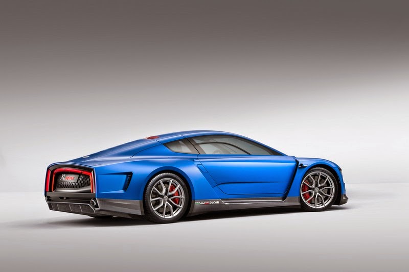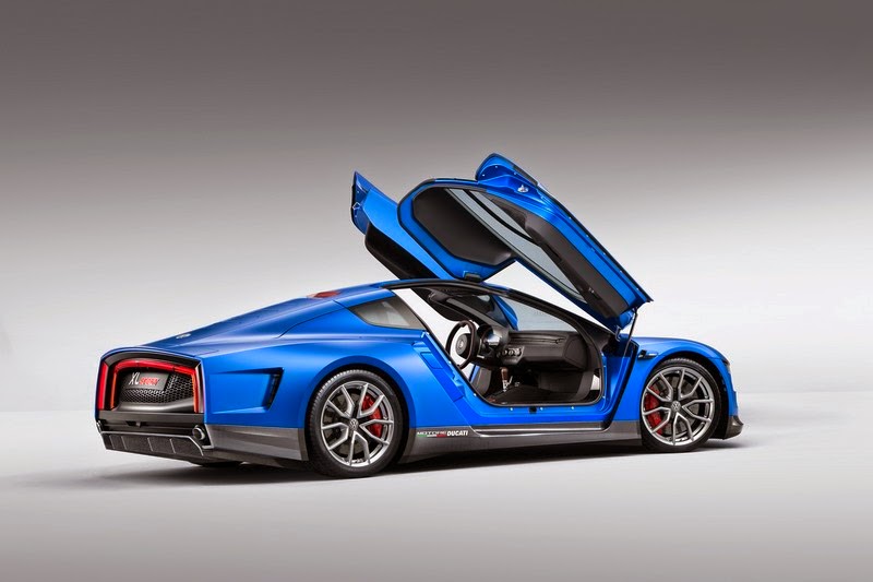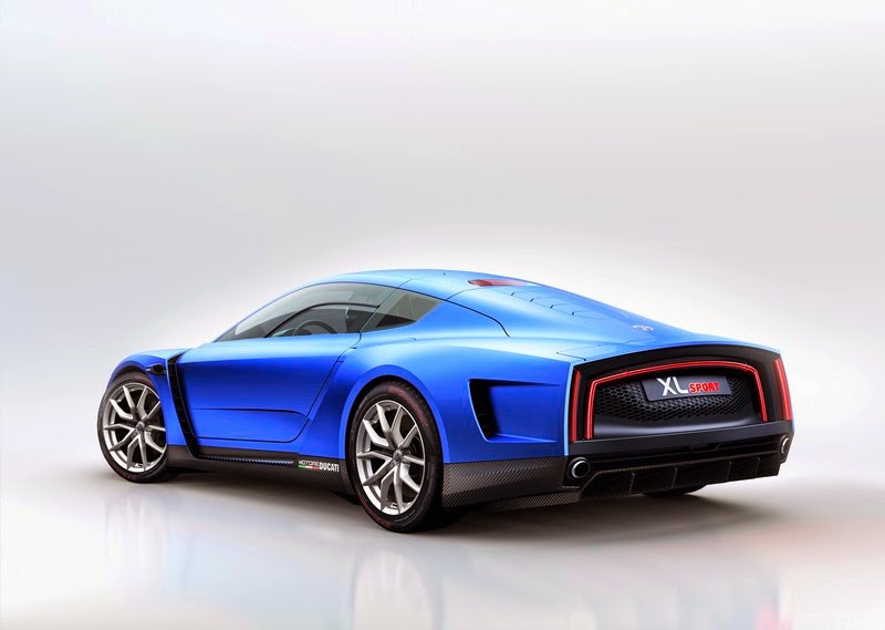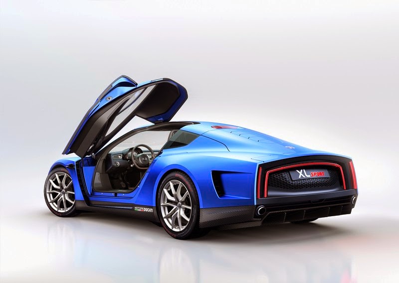 the design of the silhouette. whereas the xl1 is at its widest at the front and tapers towards the rear, the xl sport is just as wide at the back as at the front. from above, the shape is that of a classic racing car, with the doors retracted like a waist. looking at a side view of the wings and doors it is obvious why: here, at each of the a and b pillars, there are distinctive air inlets and outlets to ensure an optimum air flow and for cooling the drive unit. in addition it gives the silhouette an exciting stretched appearance that promises power yet exudes a rare elegance and a timeless beauty. observers will look for door mirrors in vain; replacing them are small streamlined cameras integrated in the wing doors: e-mirrors (digital outside mirrors) that send images of the surroundings behind the car to two displays inside the vehicle (e-mirrors made their debut in the xl1). in front of the rear wheel arches, 'motore ducati' lettering refers to the 1199 superleggera engine in the rear.