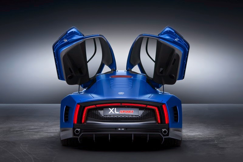 the design of the rear section. as illustrated, the xl sport gives off a completely different impression compared with the xl1, especially at the rear, as this is now significantly wider. at the same time, the new xl sport also has four specific features that catch the eye. first, the extremely wide, flat rear with its distinctive shoulders (powerful, wide surfaces above the wheels) and the extendible rear spoiler which occupies almost the full width of the vehicle's rear end. second, as with the xl1 there is the coupé-shaped roofline without rear windscreen. merging into the roofline is the rear hatch that conceals the ducati engine, the 7-speed dsg and 107 litres of luggage space. another new feature of the xl sport: a louvre comprised of five slats that are seated flush in the rear hatch, which, depending on the temperature, open automatically to cool the drive unit. third, the iconic red led ribbon that follows the shape of the rear section. at the sides the ribbon is framed by another, vertical, led element which serves to emphasise the width of the xl sport. fourth, there is a black diffuser that merges almost seamlessly into the completely enclosed underbody and is finished at each side with a chrome exhaust tailpipe.