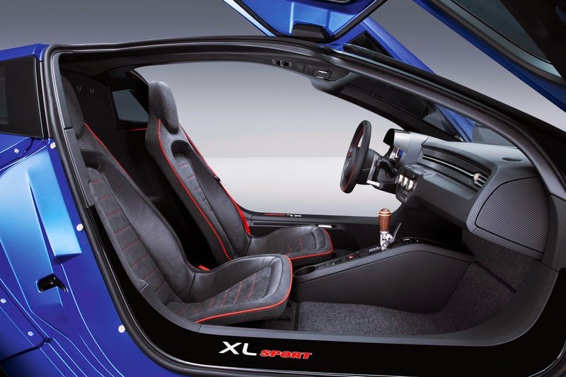 interior design. the interior of the xl sport is based on the interior of the xl1, but has been modified and individualised with a number of special details conforming with the complete realignment of the vehicle's dynamic. for example, the xl sport boasts a characteristic digital instrument cluster specially designed for motor sports, with an individual lap time and oil pressure display. a flat carbon part that extends the top of the instrument cluster covering to completely eliminate reflections. the xl sport's steering wheel has decorative red stitching and has been equipped with aluminium shift paddles to facilitate ultra quick gear shifts. there are further classy details to add a sporty touch, with anodised aluminium accents around the air vents, the climate control fascia and the dsg shift gate. picking up the theme of the contrasting red stitching in the steering wheel, the seat belts are also red. no changes have been made to the perfect ergonomics enjoyed by the driver and passenger.