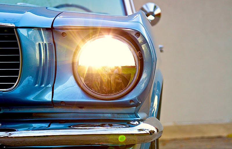 The Revology Mustang replica has many active and passive safety features that were not available on the original Mustang, including LED lighting for better visibility, four wheel disc brakes, a dual chamber master cylinder, radial tires, rack and pinion steering, side intrusion beams, collapsible steering column, three-point seat belts, and a fuel pump inertia shut-off switch.