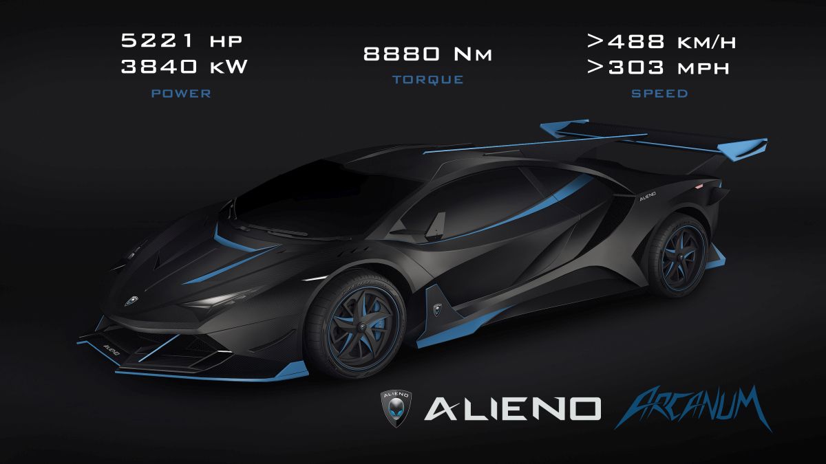 ALIENO ARCANUM is an all-electric hypercar, which in its top version has power of 5221 hp (3840 kW), 8880 Nm of torque, a top speed of over 488 km/h (303 mph) and a power-to-weight ratio of up to 2.64 hp/kg.