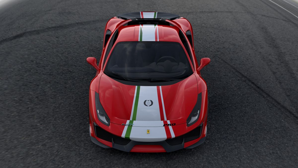 The exterior features a new livery with stripes in the colours of the Italian flag recalling the racing version of the 488 GTE, embellished by a laurel celebrating the WEC title, the logo of the championship and the word "PRO" indicating the class the car raced in. The Italian flag livery features again along the car’s flanks which are also adorned with the personal race number each client will be able to add. The version that will be unveiled at Le Mans carries the number 51 used by the world championship drivers. The matte black S-Duct and the natural carbon-fibre ‘dovetail’ suspended rear spoiler and vent surrounds round off the personalisation of the exterior.