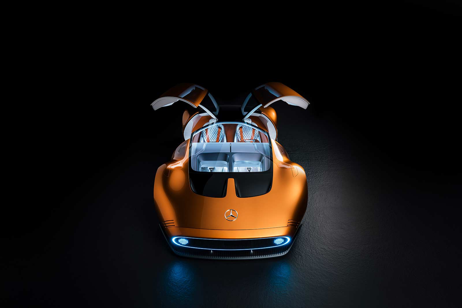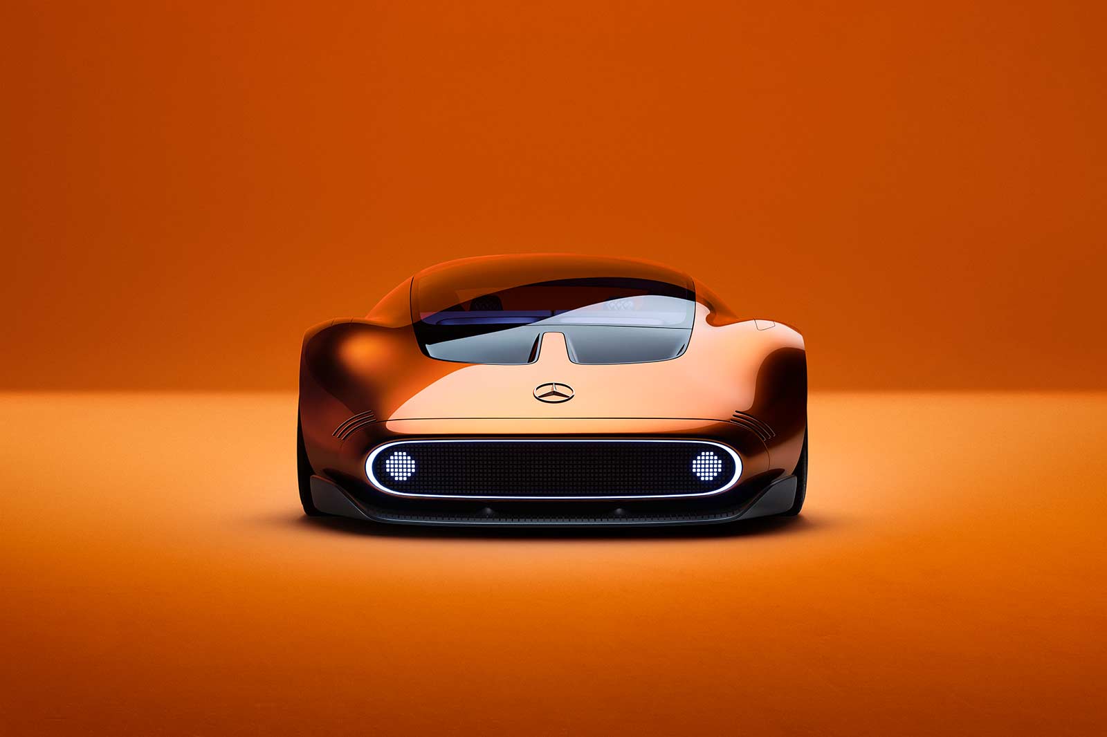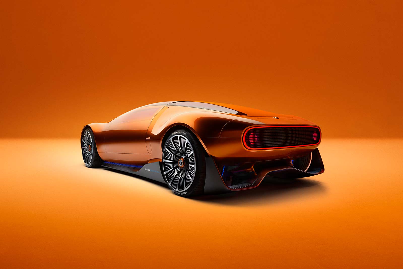 The exterior design of the Vision One-Eleven showcases the iconic One-Bow design executed with a modern twist. The smooth bow shape gives the car a sculptural feel, complemented by the copper-orange alubeam paintwork that pays homage to the C 111's distinctive color. The gullwing doors, flush-fit windows with a pixelated pattern, and large-diameter wheels seamlessly integrated into the wheel arches further enhance the sporty and aerodynamic character of the vehicle. The dark "keel line" on the lower portion of the bodyshell creates a powerful connection between the car and the road, amplifying the sense of unity with the surface.