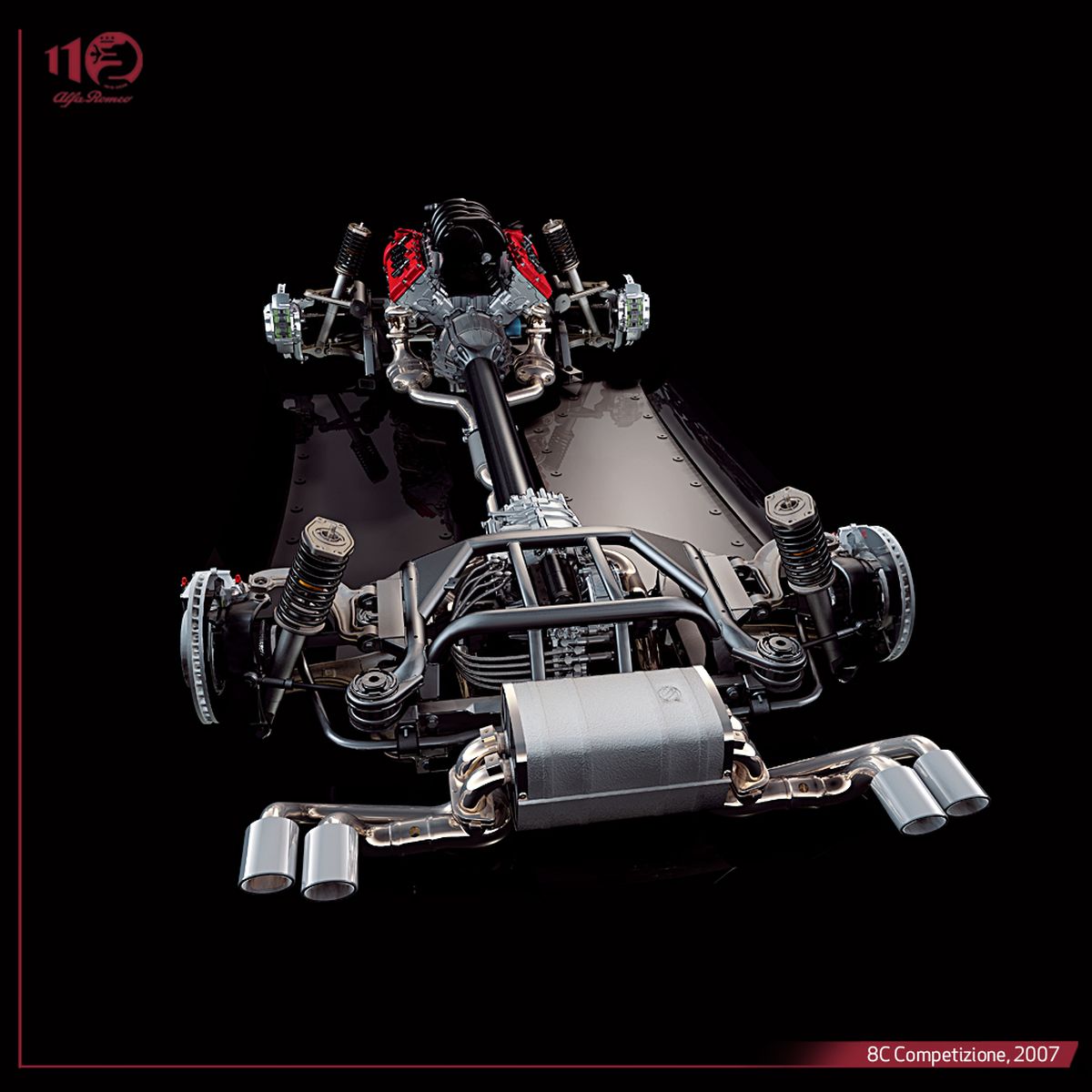 Created to synthesise and relaunch the quintessence of Alfa Romeo, the 8C echoed technical themes dear to the brand since the beginning. Lightness was enhanced by the "dual frame" and by the use of aluminium, titanium, carbon and composite materials, the weight balance between front and rear was obtained using a "transaxle" system (longitudinal front wheel drive and rear-axle gearbox) and driving precision was further refined through the use of suspension systems with double transverse arms on both axles.