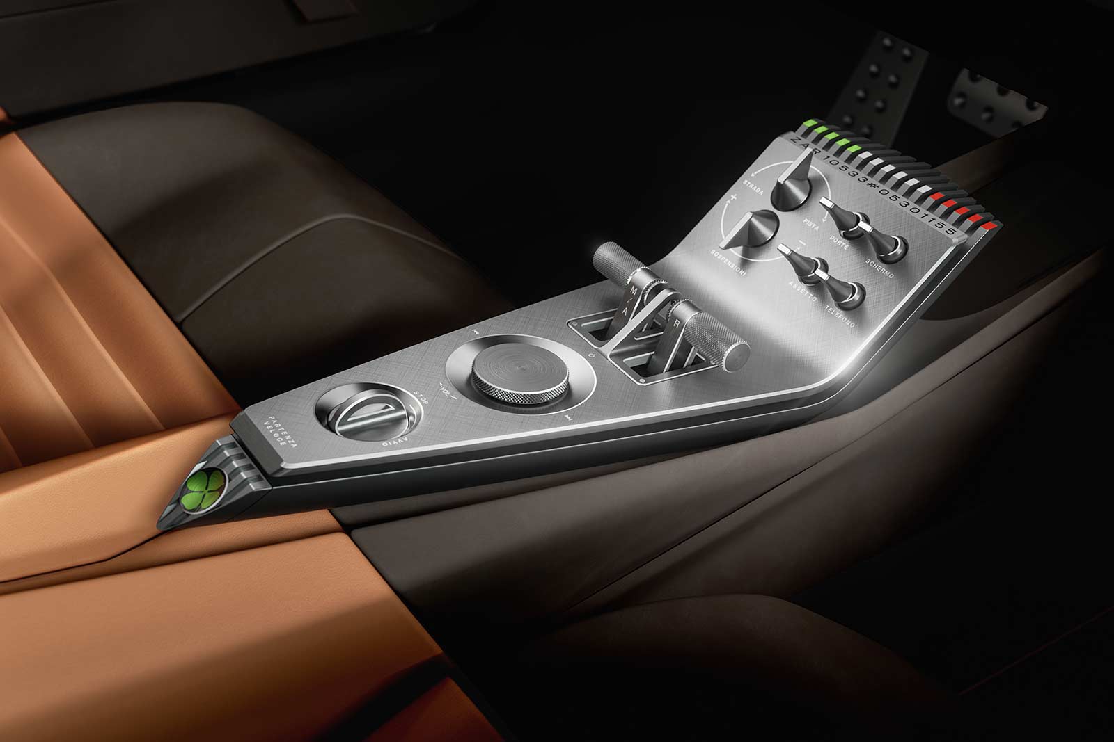 The cabin design draws inspiration from the original 33 Stradale and offers a limited number of controls on the center console. The driver's focus is directed towards a 3D telescopic display in front, which engages the driver in a unique interaction. The steering wheel, devoid of buttons, serves as the primary means of communication with the car and is adorned with aluminum shift paddles, enhancing the driving pleasure. Controls are situated at different levels, resembling an airplane cockpit, with some located on the low center console and others on a higher plane on the roof's interior.