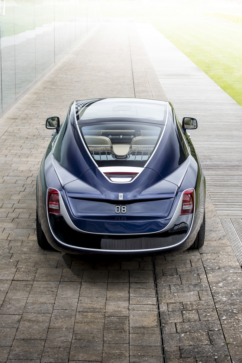 the coup de gras of the rear is the ultimate homage to the world of racing yachts that inspired the client, with its raked stern. seen directly from behind, the rear taper contrasts strongly with the front of the motor car, shaping a completely new perception of a dramatic rolls-royce coupé.
