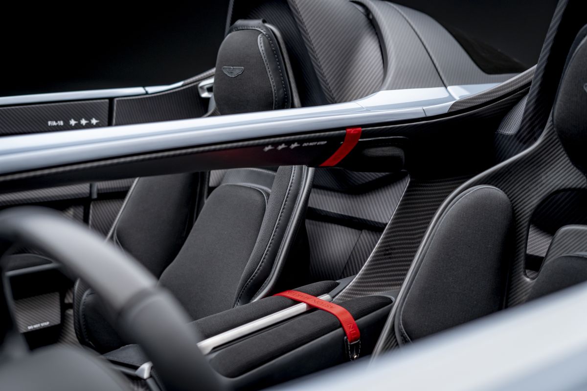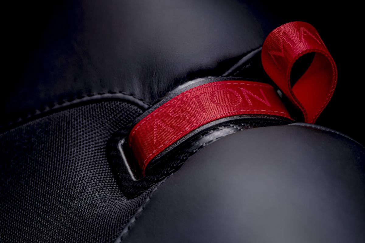 The interior specification pushes new boundaries, using a mix of traditional and modern materials. Structural satin carbon fibre, contrasts with traditional hand-crafted Saddle Leather, chrome, aluminium and even 3D printed rubber. Visually and physically the interior reduces mass, for a leaner, efficient style, but one that retains all the emotion and craftsmanship Aston Martins are renowned for. In front of the passenger is a removable leather bag in place of a traditional glove box, while there's additional storage space under the rear bumps for luggage.