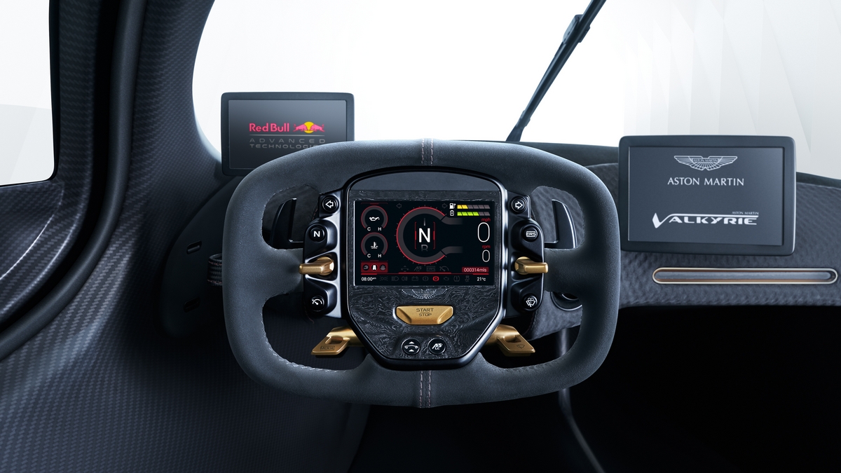 the aston martin design team were keen to keep distractions to a minimum and focus the driver on the road ahead. to this end all switchgear is located on the steering wheel, with all the vital signs shown on a single oled display screen. the steering wheel is also detachable, both to aid ingress and egress, and to serve as an additional security device.