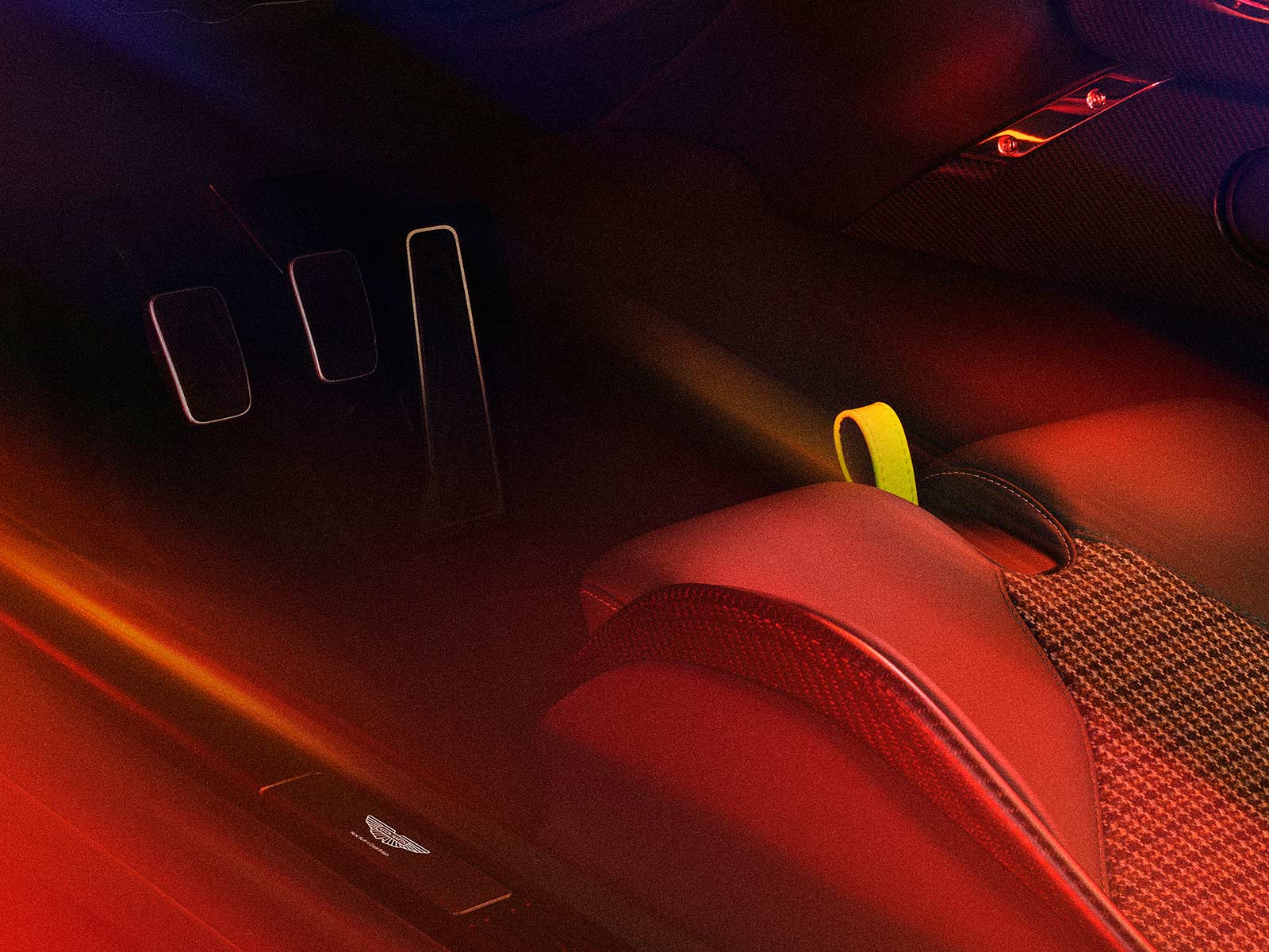 The exterior design of Valour combines Aston Martin's contemporary design language with cues from the iconic V8 Vantage. The carbon fiber bodywork is aerodynamically optimized, with a prominent front splitter, fender vents, and a rear diffuser that enhance stability and balance. The rear design features Valkyrie-inspired LED tail lights and a triple tailpipe exhaust system.
