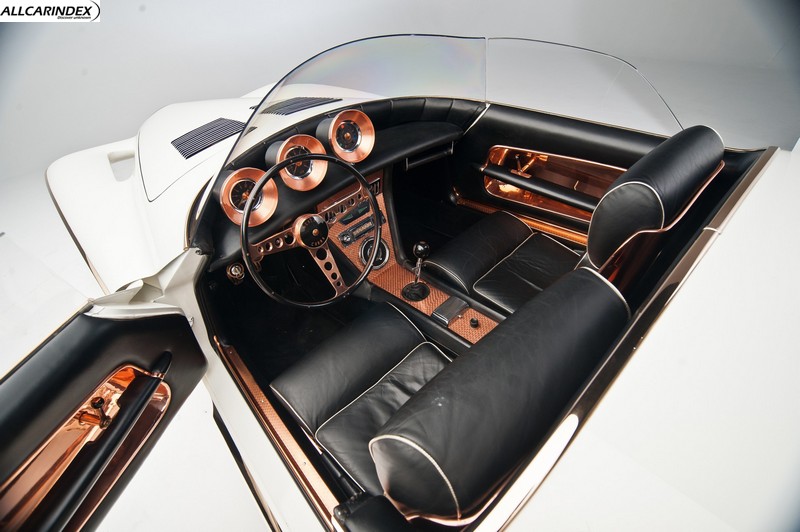 the copper development association’s mercer-cobra exploited the dramatic colors and textures of copper and copper-based materials to its advantage, particularly with the brass-era theme of the mercer. some eleven different materials, alloys and finishes were employed in both the interior and exterior to demonstrate the diversity of copper and brass. exner’s design emphasizes the long hood and pushed-back passenger compartment with long blade-style front fenders open along the hood sides, abbreviated rear fenders with separate mudguards behind the rear wheels and a long, tapered rear deck. a classic-style brass grille with eight large elements in front of mesh stone guards proudly leads the mercer-cobra’s design statement. the headlights are ingeniously mounted on pivots where they swing back flush with the sides of the nose when not illuminated. exner later observed, “our overall aim was to create an interesting and stimulating design rather than one which simply follows the ‘formula’ of a flat, low snout with a horizontal air scoop and a squared-off bobtailed rear.”