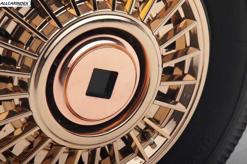 for practical purposes, brass and copper elements were covered with an acrylic coating to prevent discoloration and exterior moldings made of silicon bronze. the taillights are recessed in brass tunnels integrated with the rear-wheel mudguards. interior trim, seat backs, door panels and dashboard gauges are executed in copper while a high-strength chromium-copper alloy is used in the steering-wheel spokes. the 16-inch wire wheels have multi-piece brass covers. chrome plating is used deftly but sparingly throughout, mostly on a brass substrate, to accent the richness of the brass and copper elements. the engine has been given the brass and copper treatment on the valve covers, air cleaner, oil filler cap and dipstick housing. this treatment continues in the silicon bronze heat shield protecting the body and passengers’ legs from the chrome-plated side exhaust pipes. even the brake discs are made from copper alloy where the high heat-transfer rate promotes exceptional performance.