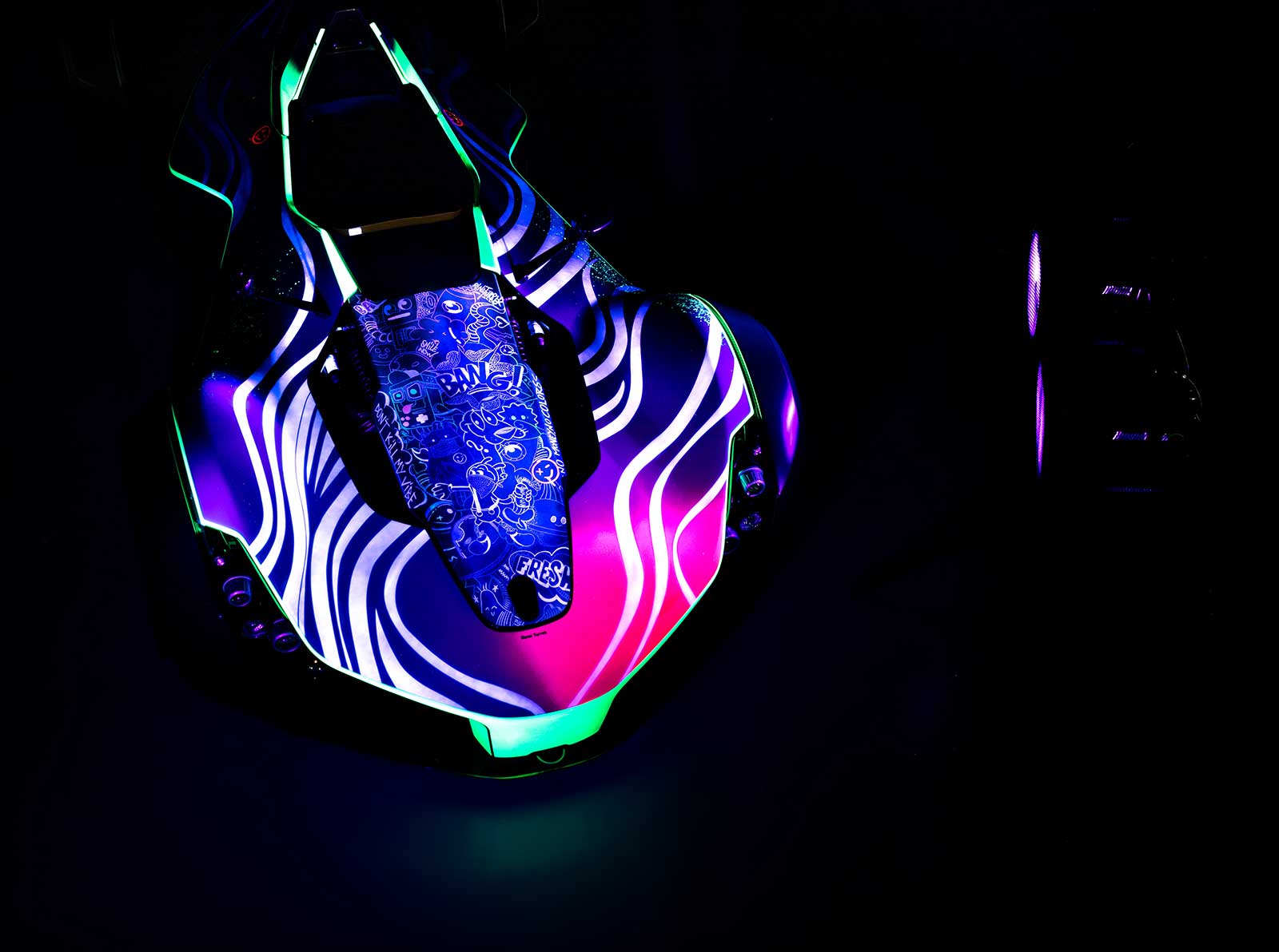 The Art Car Mono has been designed with a special paint which, when subject to ultraviolet light, reveals the true depth of Turrek’s artwork. The Art Car Mono was revealed at the recent Sleeping With Art event held at Hedsor house, where it was housed in a blackout room and displayed continuously under UV light for art lovers to enjoy.