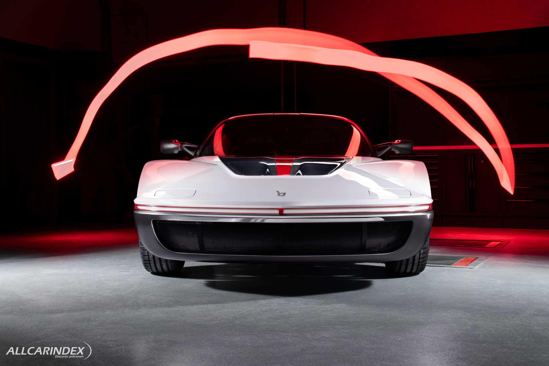 The bodywork features extensive carbon fiber construction integrated with a lightweight bonded aluminum chassis built from extruded aluminum architecture. At the front, an integrated S-duct manages airflow for cooling efficiency and aerodynamic balance. Reinterpreted pop-up headlights reference classic design elements within contemporary surfacing, while a continuous horizontal element connects the sculpted fenders.