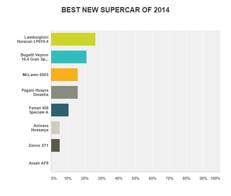 BEST NEW SUPERCAR OF 2014 has been selected the LAMBORGHINI HURACAN LP610-4 (26% of all responses)