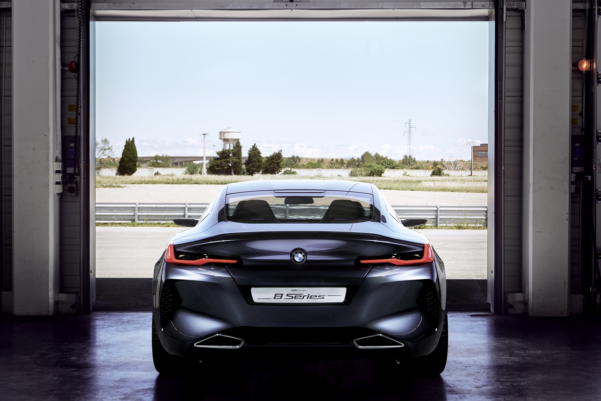 the rear: bold and modern. emotional surfacing also dominates at the rear of the bmw concept 8 series, creating a low, highly sculpted tail with maximum width-enhancing effect. the rear is defined by the interplay between volumes and lines, which extend around from the flanks and shape the rear section of the car. the powerful wheel arches hint at the car’s dynamic talents and advertise its rear-wheel drive. and the tapering of the passenger cell and the car’s wide track shine a particularly vivid spotlight on this area of the car.