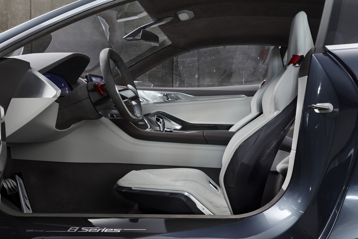 the interior of the bmw concept 8 series actively explores the contrasts between emotion and engineering, dynamic flair and luxury; its form suggests supreme sportiness, while exquisite materials exude exclusivity and high-grade design. for example, all of the driver’s contact points with the car are brimming with sporting character. the exclusive sports seats are slim in design, the carbon-fibre shell providing the basic structure and the finest leather making them the perfect place to sit. the steering wheel continues along similar lines, its hand-polished aluminium spokes arrowing forward purposefully, and the red-anodised shift paddles bring the race track to mind. the contrast of aluminium and dark leather on the gripping surfaces emphasises this luxurious sense of sportiness in various details.