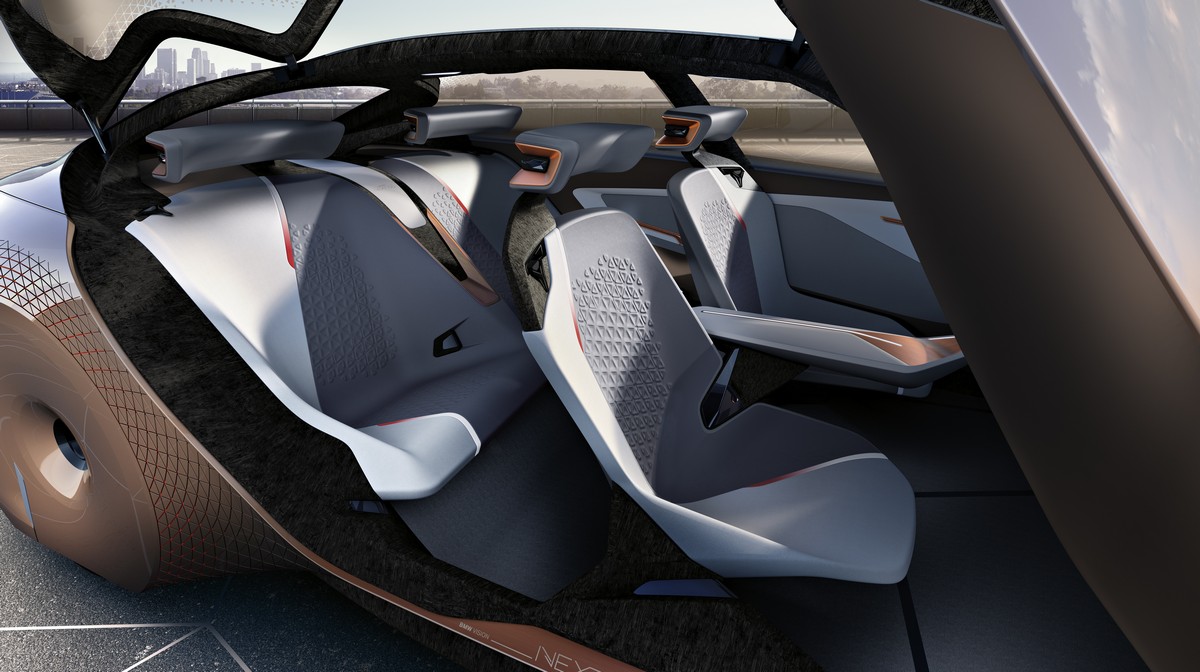 the designers of the bmw vision next 100 primarily used fabrics made from recycled or renewable materials. the visible and non-visible carbon components, such as the side panels, are made from residues from normal carbon fibre production. in the future, the choice of materials will become even more important throughout the design and production process.