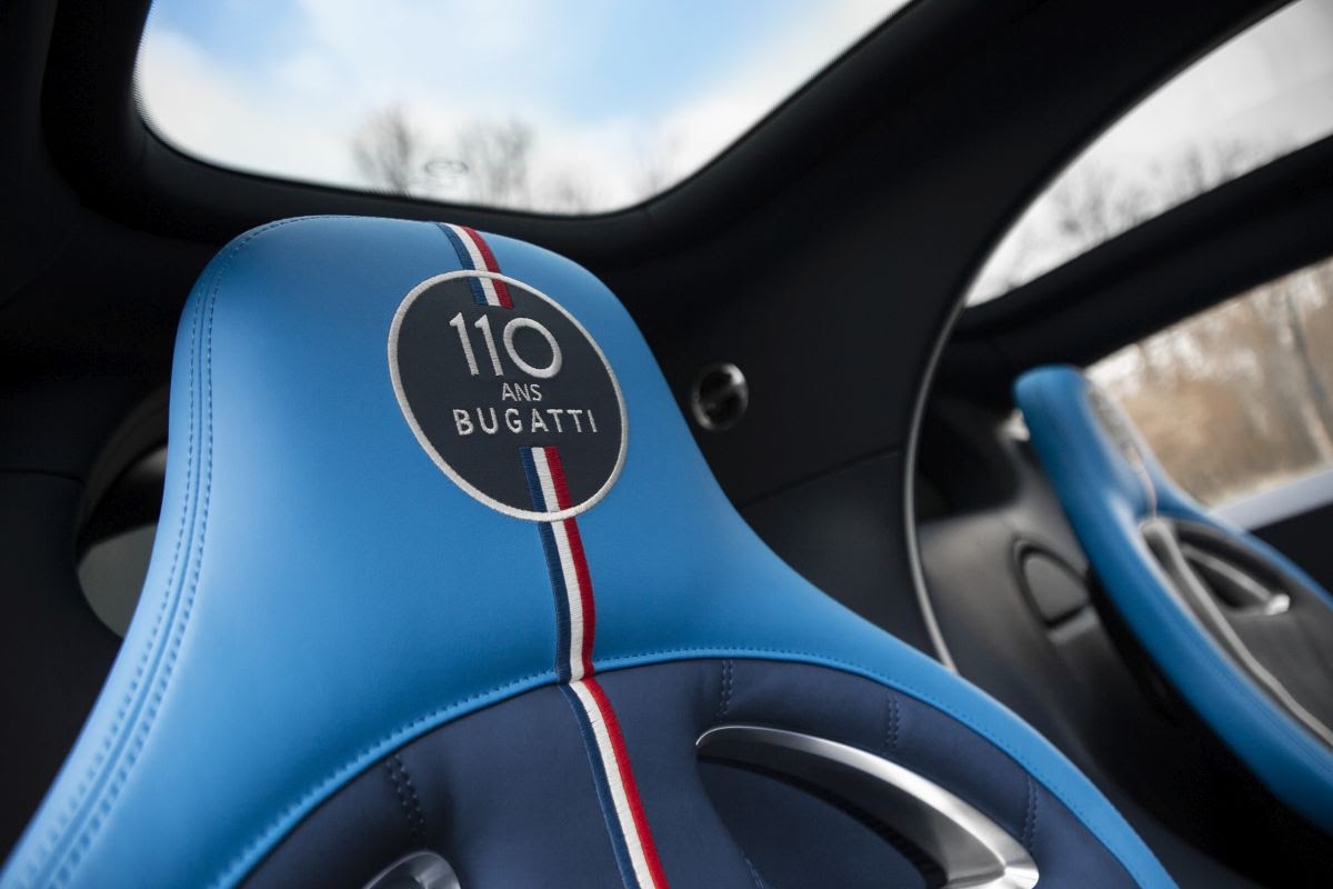 Behind the alloy wheels painted in “Nocturne” matt black, the bright blue (French Racing Blue) brake calipers are visible. To obtain an immaculate finish, the aluminium filler cap is sandblasted and hand-polished. The “110 ans Bugatti” emblem, with the French flag running vertically through the logo, features at the centre of the cap.