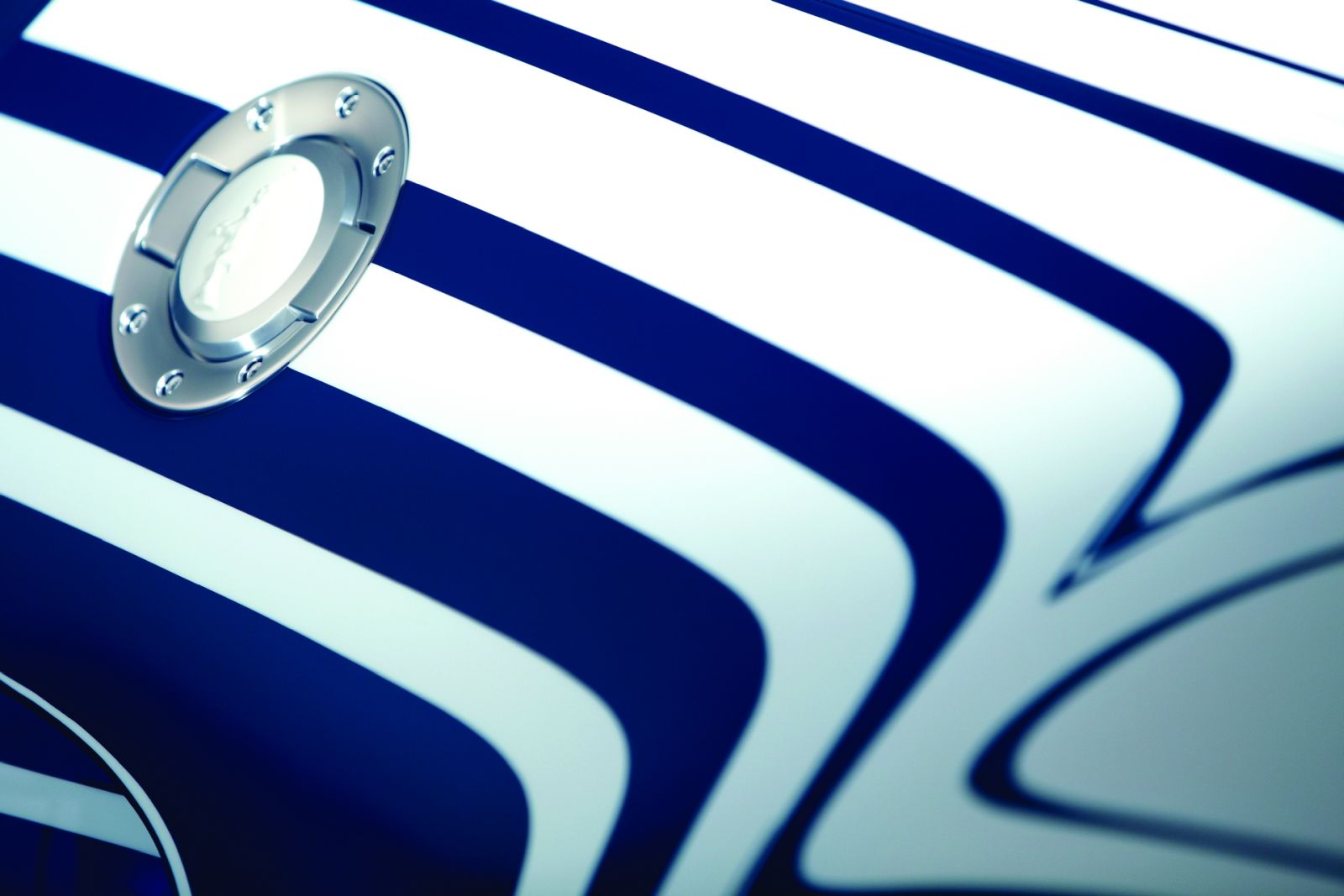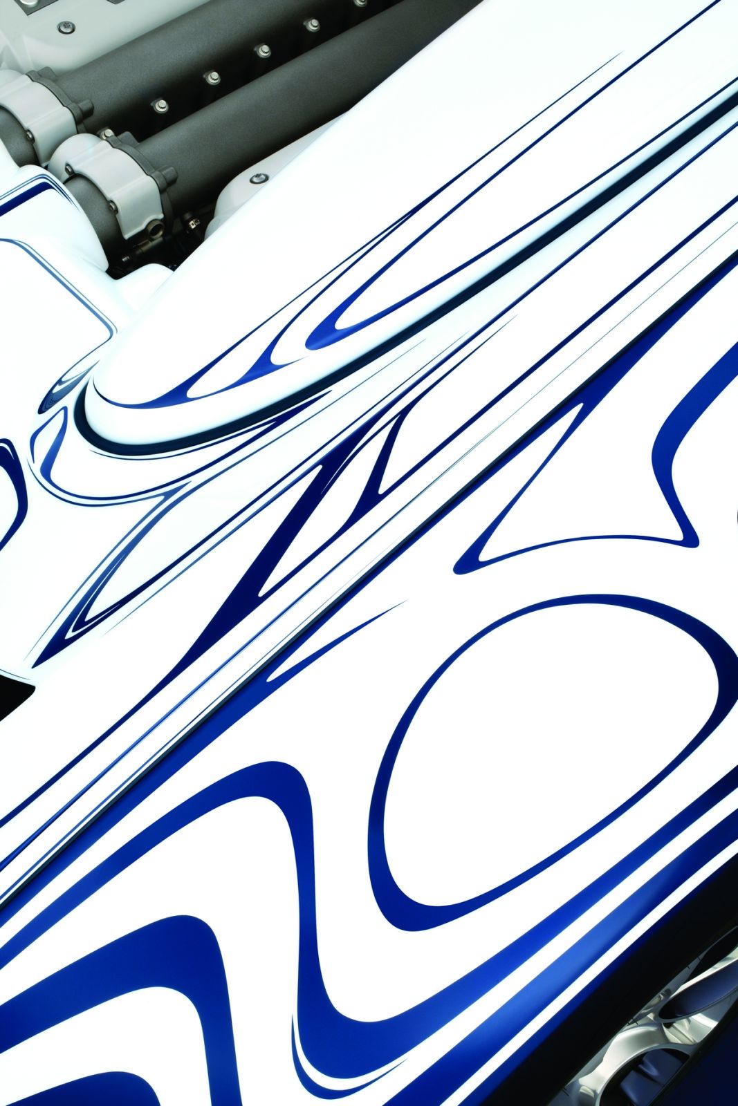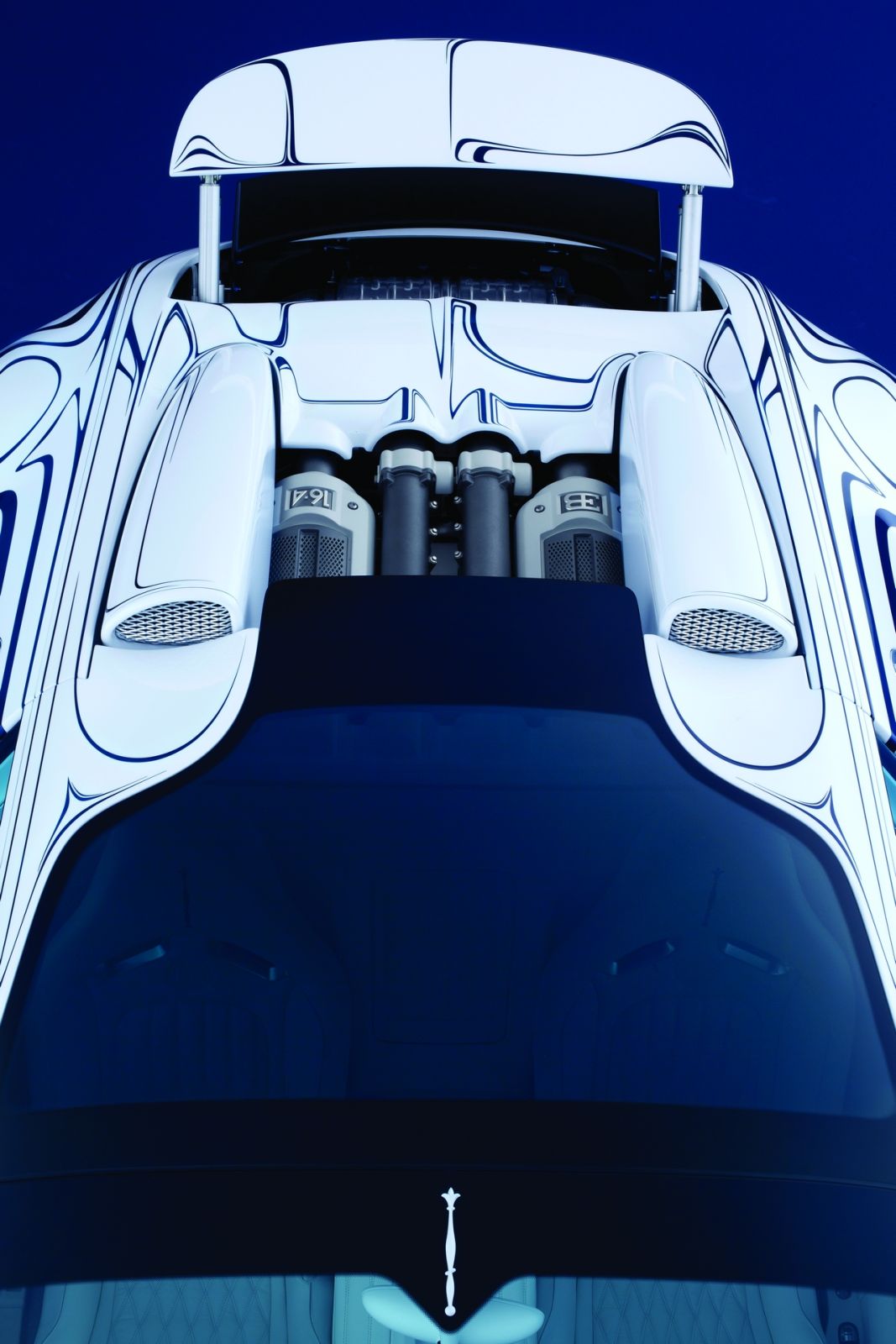 in the next step, bugatti’s paint specialists dedicate themselves to the further completion of the masterpiece. over the course of three weeks, each millimeter of the marked lines are being filled by hand with the characteristic blue color. in addition, the whole body receives five layers of clear lacquer. a varying and powerful gradient of the two colors is generated because the team had used a combination of tapes with different widths. while the blue lines dominate over the white spaces in the lower section of the convertible, the relation of colors inverts on the way to the roof so that the intense white appears even stronger. twelve elements, made of finest porcelain at the berlin based manufactory, complete the aesthetic approach of this special grand sport.