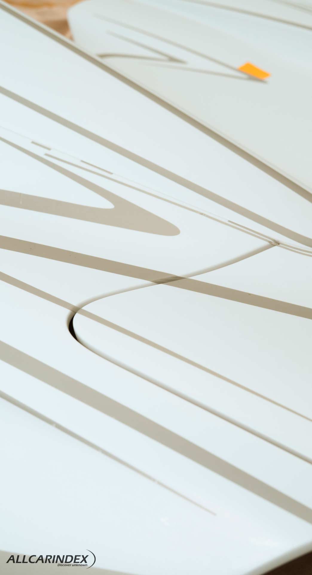 Inside the cabin, the ode to elegance continues with a concentrated, jewel-like cockpit. All interior carbon components are painted white, maintaining the precious aesthetic established by the exterior. The door panels are adorned with alternating white and warm gold linework that follows the concave geometry of the surfaces. To further enhance the sense of reflection, the team integrated warm ambient lighting and utilized machined, polished aluminum for the steering wheel accents, center console dials, and door handles.