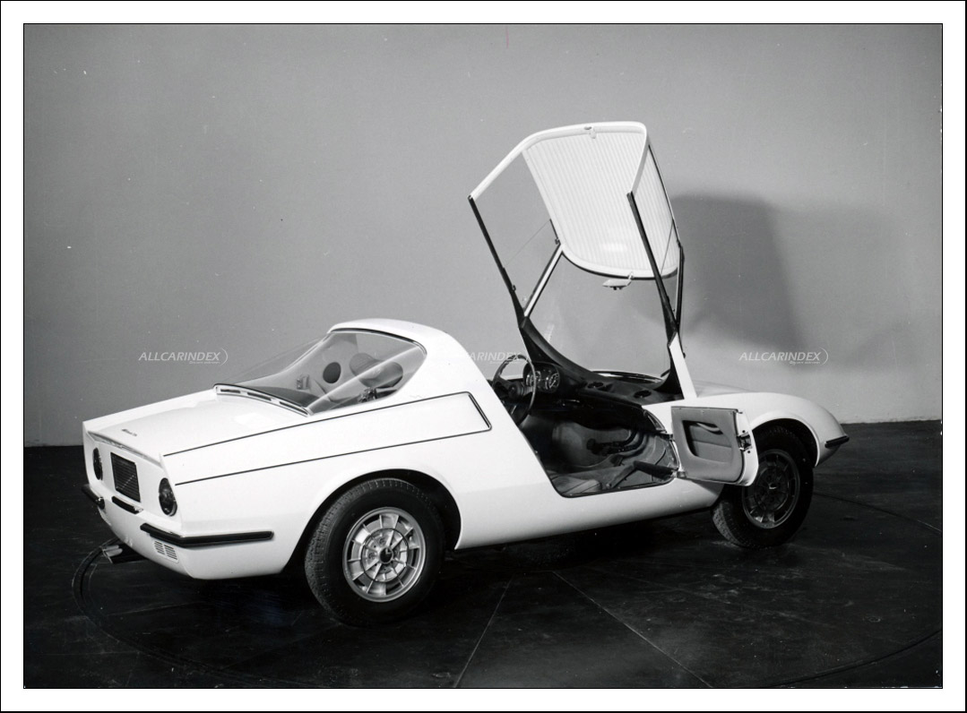 The Fiat Abarth 100 Special Coupe was a stunning creation from the collaboration between Pinínfarina and Abarth Co. The sleek 2-seater Coupe was powered by a Fiat Abarth 1000 - 4 cylinder engine with 54 HP-DIN, derived from the Fiat 850 model. The design featured a slender and low appearance with a lenticular front end and thin aerodynamic fenders. The front lights, specially made by Carello Co., were protected by a transparent fairing. The side windows and windshield formed a seamless element that could be tilted forward for easy access to the car. The rear window provided excellent visibility, while the rear end housed the mechanical group.