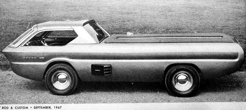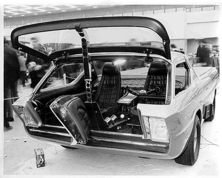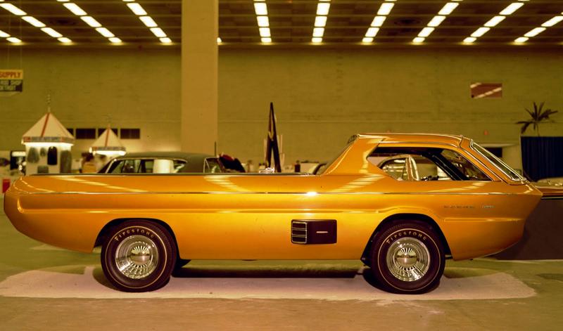 The radical Deora customized truck was based on the Dodge A-100 pick-up truck and fabricated in metal by the Alexander Bros. of Detroit. The windshield rose up like a tailgate on a wagon, allowing the lower front section short of the headlights to swing open. At the same time, the steering gear swung to one side for easy driver entry and exit. The engine instruments were located on a panel to the left of the driver, with the tachometer and speedometer housed on a center console. The Deora was powered by a slant six-cylinder engine, with the option to fit a 318 V-8.