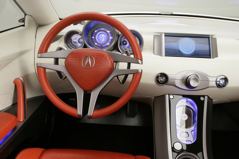 Inside, the RD-X boasted an ultra-modern driver-oriented cockpit with a sizeable, easily transformable cargo area. The interior featured a combination of ivory leather and suede trim, tangerine-colored crocodile-embossed leather, and off-white suede. The cockpit included an eight-inch color LCD screen, the Acura Navigation System with Voice Recognition, a clear acrylic wing, and metallic gauges.