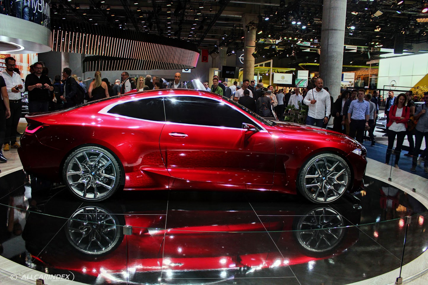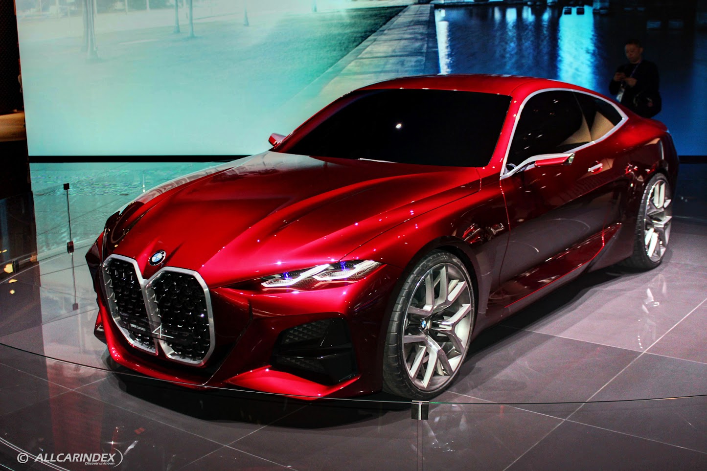 Moving to the side of the car, the BMW Concept 4 displayed BMW’s signature proportions in a modern and elegant design. The powerful main body with tautly chiselled volumes and precise contours created a rare sense of emotion and dynamism. The Forbidden Red exterior paint accentuated the car’s surfaces, projecting a rich, glossy red in the light and almost black in the shade.